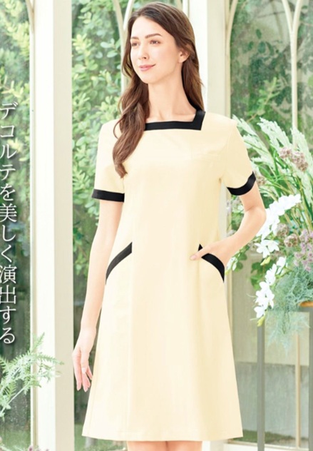 ワンピース 21-E3133デコルテもスタイルも美しく。衿元のスクエアカットが女性のデコルテを美しく演出する美人ワンピース。ブラックの配色できりっと引き締め効果のあるデザインです。華やかさが香るエレガントな一着です。 |
