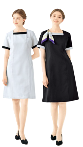 前面の切り替えによりタテ長効果のシルエットを表現したスマートワンピース。